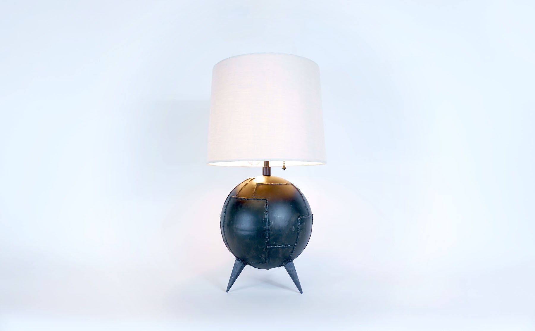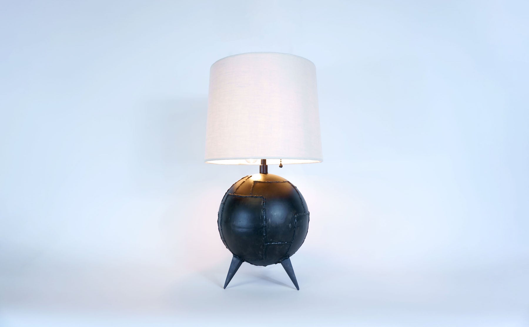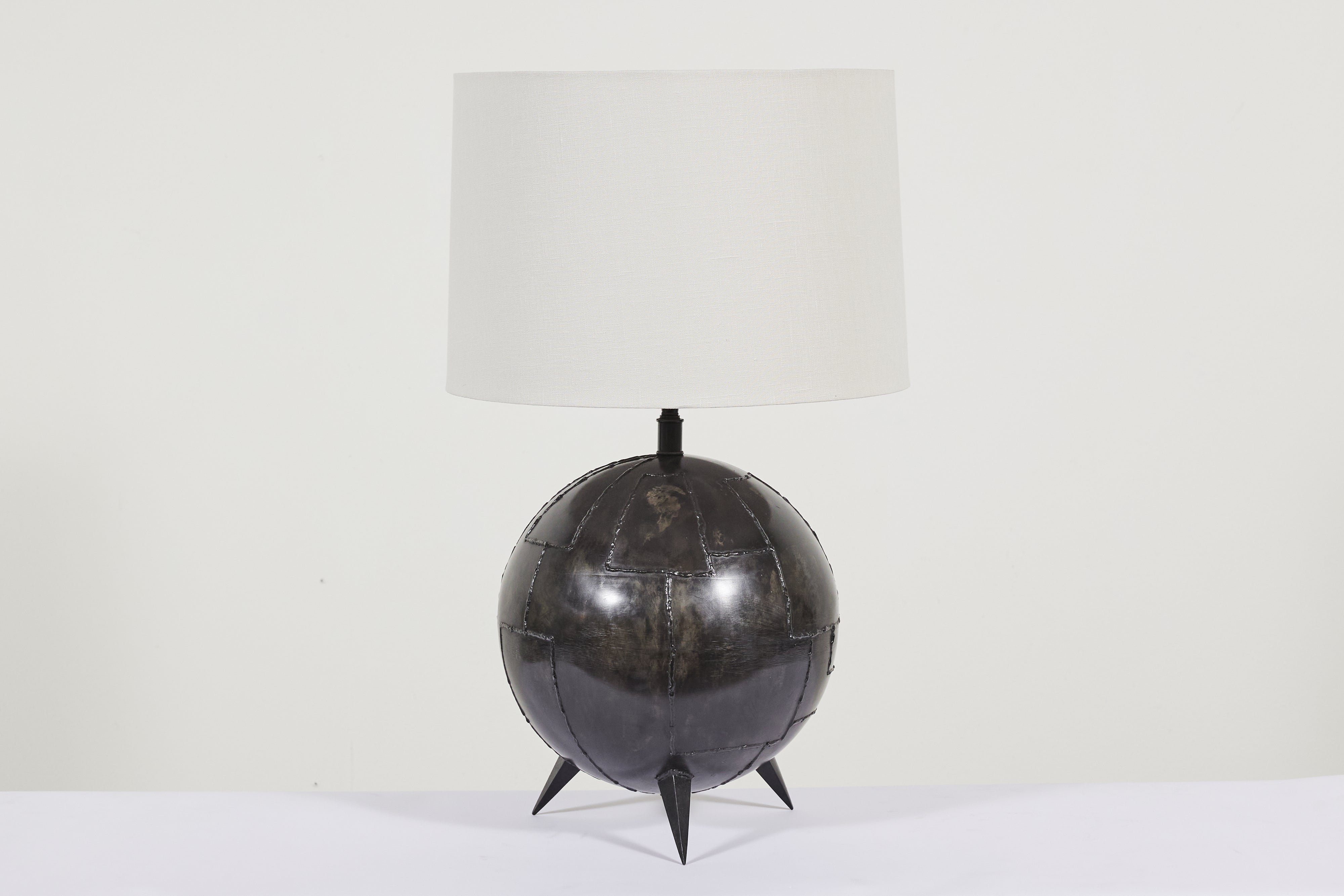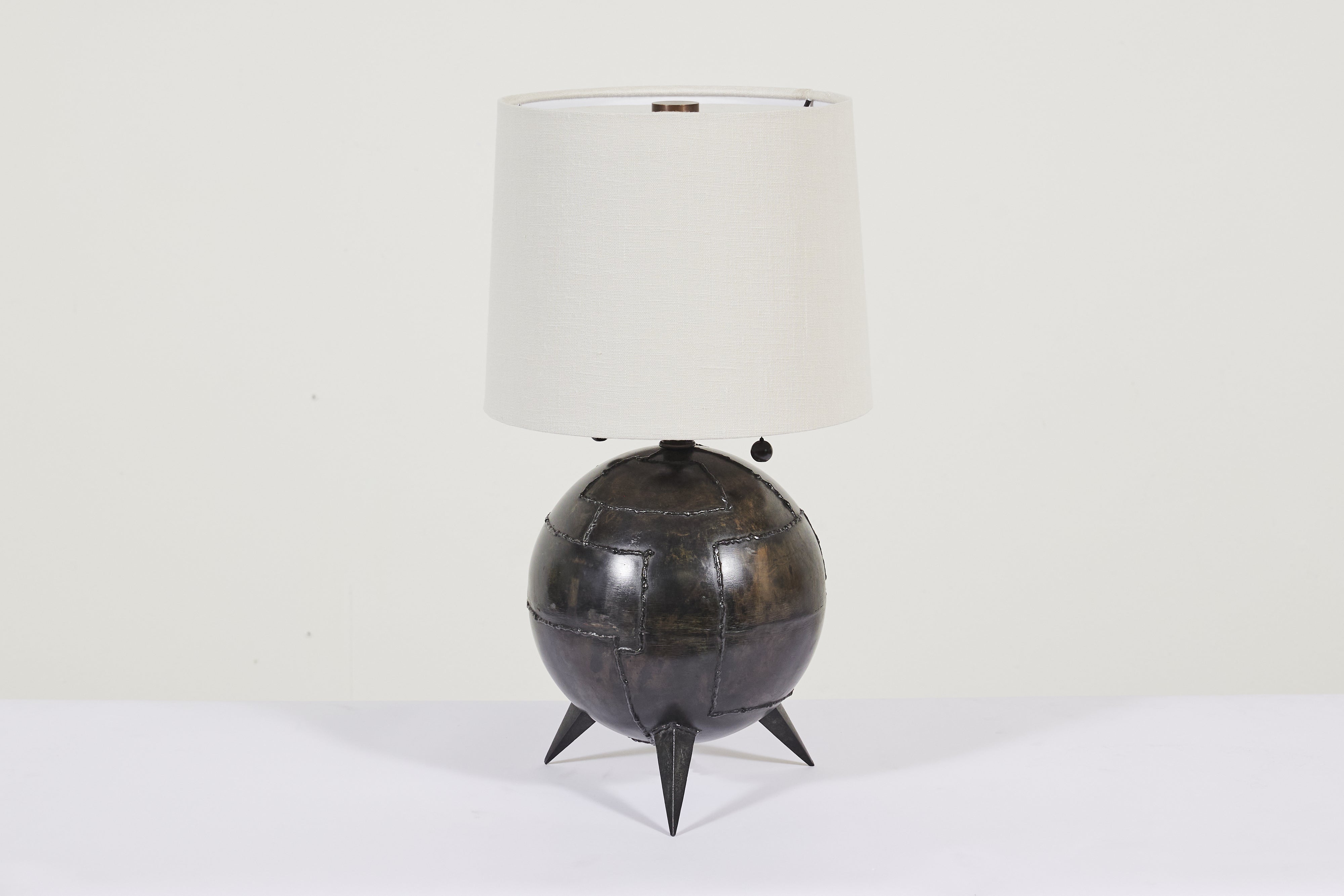 Hollow steel spheres are cut, welded, blackened, and waxed by Los Angeles-based artist and designer Kit Howland to create a patchwork Brutalist table lamp that would look stunning atop a night stand or credenza. The spheres are held up by three metal spike feet and feature a double bulb socket for different degrees of brightness. Linen shade is included.