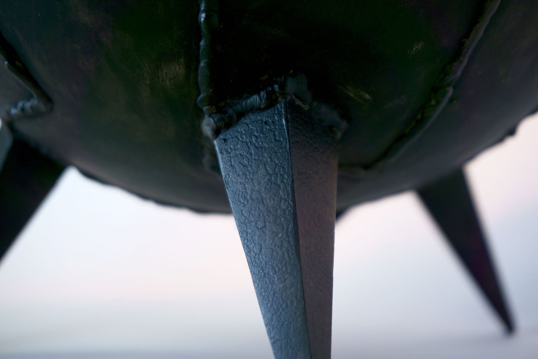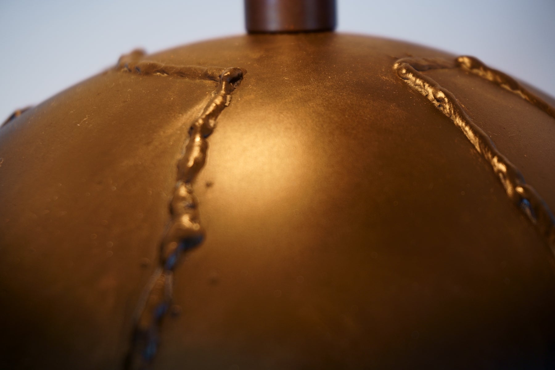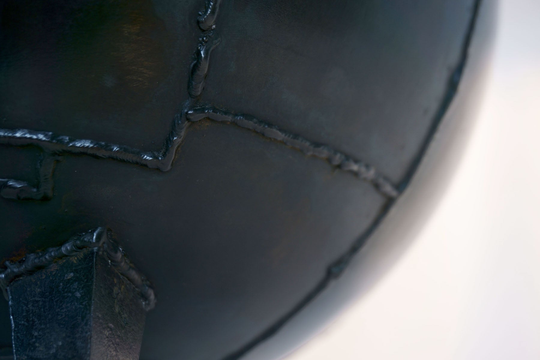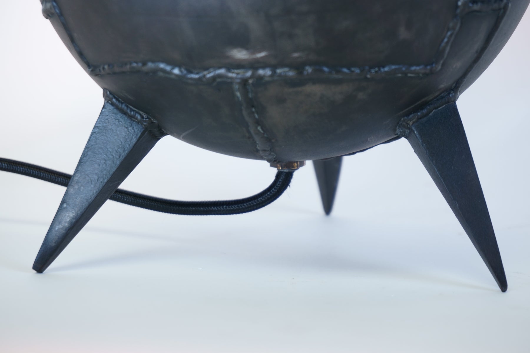 Hollow steel spheres are cut, welded, blackened, and waxed by Los Angeles-based artist and designer Kit Howland to create a patchwork Brutalist table lamp that would look stunning atop a night stand or credenza. The spheres are held up by three metal spike feet and feature a double bulb socket for different degrees of brightness. Linen shade is included.